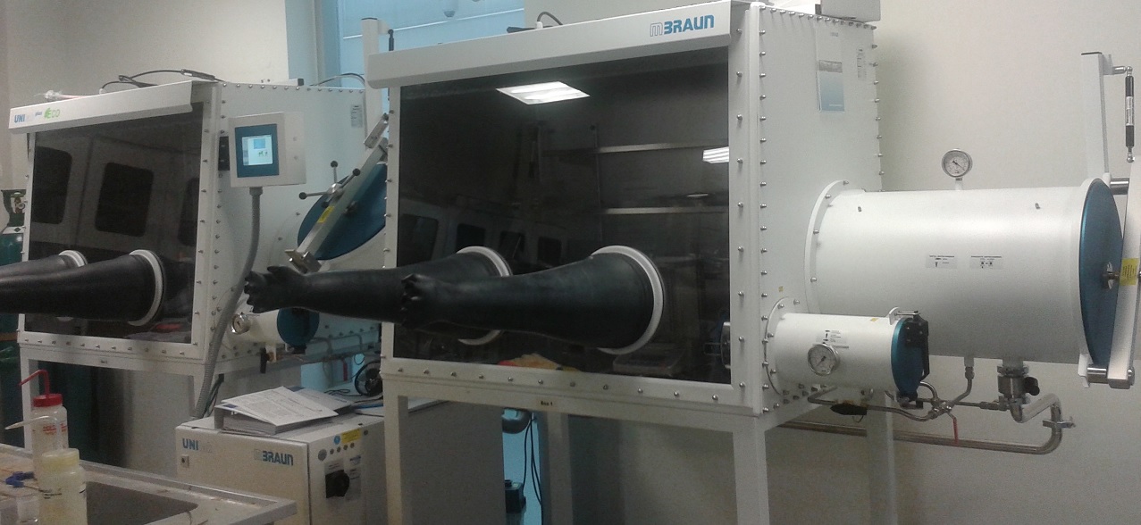 double workstation 4-port glove box with T-antechamber and integrated freezer for working with air- and moisture-sensitive materials located in JBF303